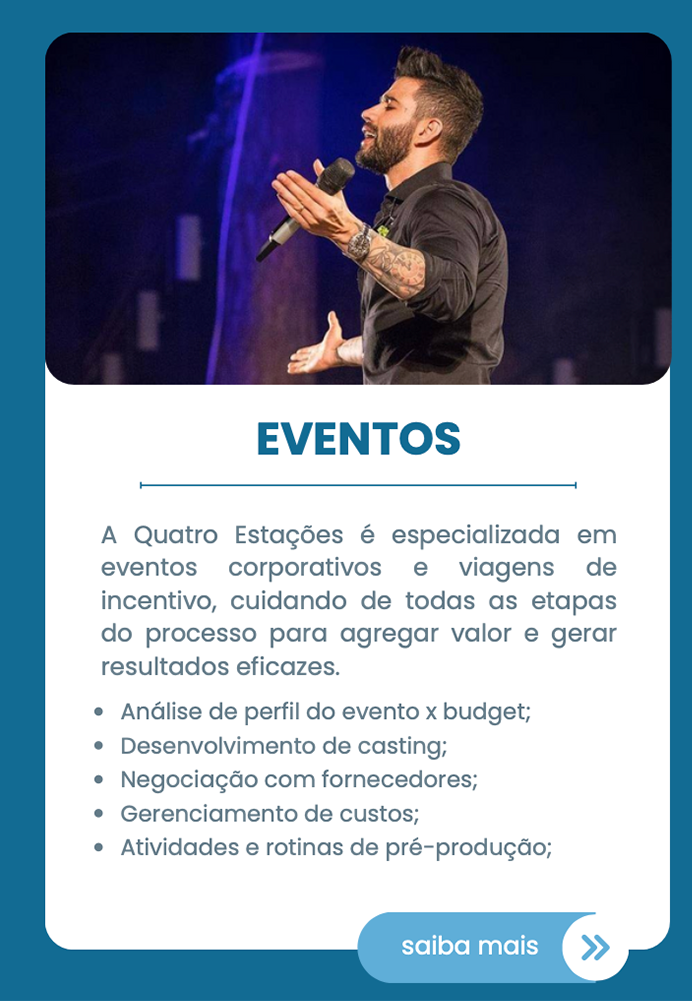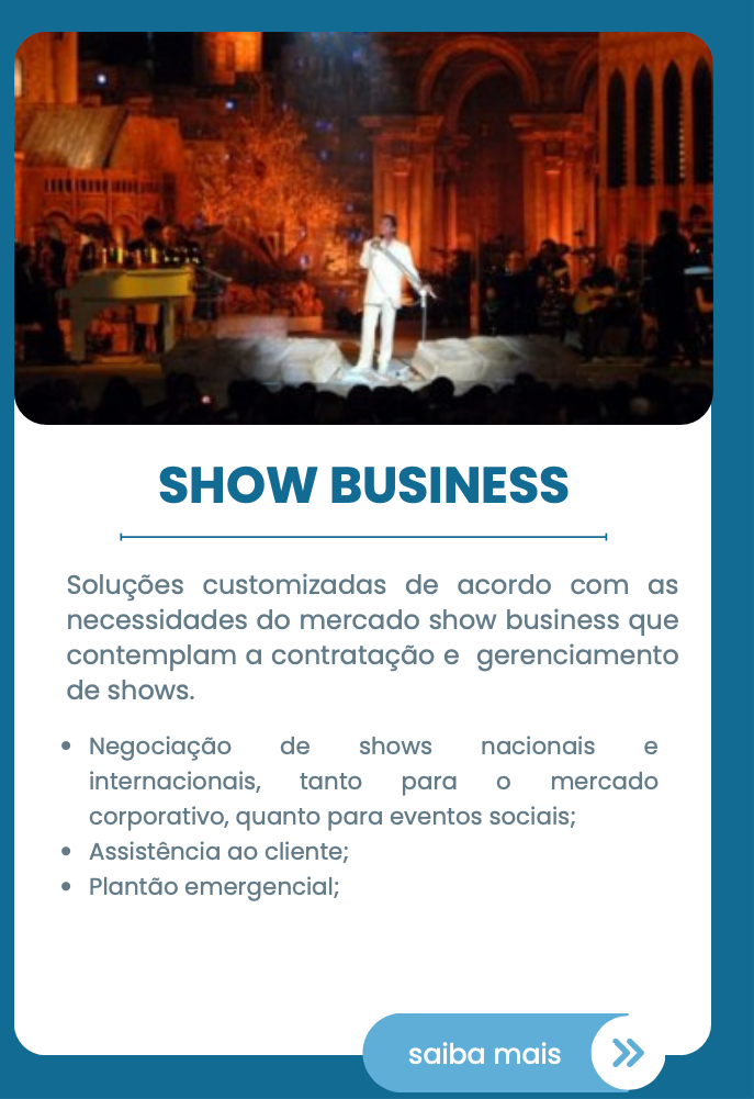 Com uma equipe altamente qualificada, identificamos os interesses, desejos e necessidades de cada cliente, oferecendo uma consultoria personalizada e inovadora nos setores de lazer, corporativo, show business e eventos.